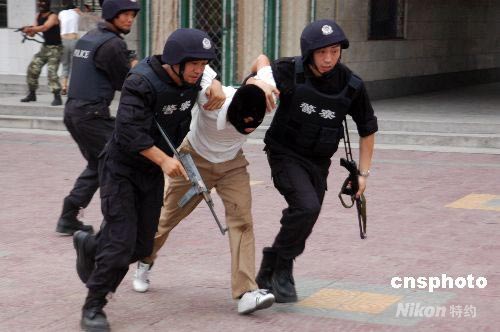 7月14日,安徽省亳州市警方举行“2008利剑行动”奥运安保反恐演练,公安、武警、消防各警种密切配合,上百名特警队员进行了解救人质等课目的实战演练,充分显示了已全面做好奥运防范和处置各类恐怖袭击事件的准备。图为安徽亳州警方特警队员在反恐演练中。 中新社发 张延林 摄