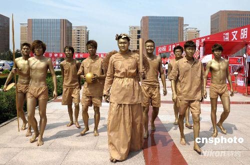 7月14日,奥运火炬在吉林长春传递。在传递终点长春雕塑公园,青年们装扮成体育雕塑“传递”火炬。 中新社发 廖攀 摄