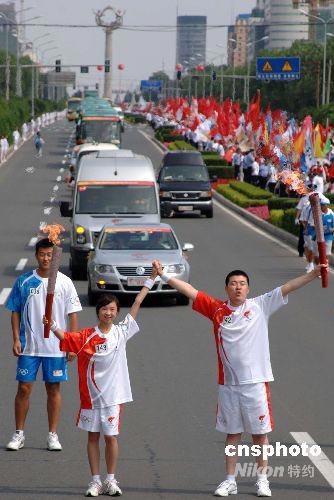 7月14日,奥运火炬在吉林长春传递。图为火炬手东北师大附小学生袁萌(左)和火炬手王洪岩交接火炬。 中新社发 廖攀 摄