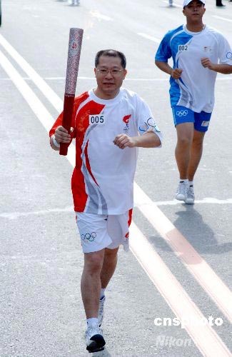 中央电视台副台长孙玉胜在吉林长春传递奥运火炬。中新社发 廖攀 摄