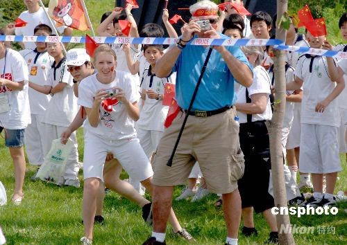 7月14日,奥运火炬在吉林长春传递。当地外国友人在路线沿途热情观看奥运火炬传递。中新社发 廖攀 摄