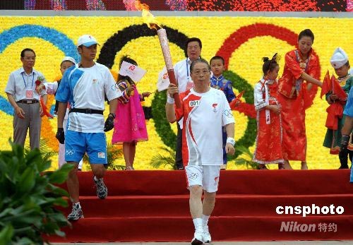 7月15日,奥运火炬在吉林松原传递,火炬手李述跑出首棒火炬。中新社发 廖攀 摄