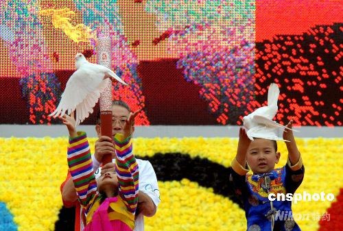 7月15日,奥运火炬在吉林松原传递,少数民族儿童在火炬手起跑前放飞白鸽。中新社发 廖攀 摄