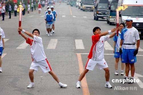 7月15日,奥运火炬在吉林松原传递。火炬手屈万日(右)、张世民以优美姿态交接火炬。中新社发 廖攀 摄