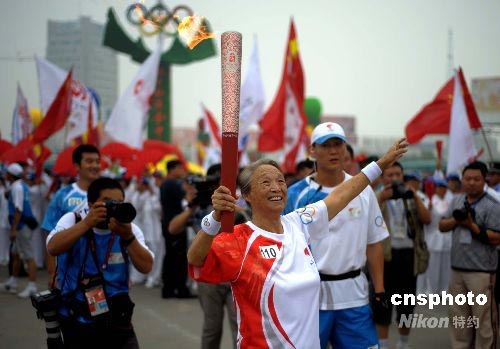 7月15日,出演过《希望的田野》等电影的著名演员柏青在东镇广场传递完松原最后一棒火炬后,奥运火炬在吉林松原的传递结束。 中新社发 廖攀 摄