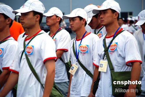 7月15日早上,驻京海军某部300名官兵身着统一服装到鸟巢参加奥运开幕式彩排。 中新社发 杨慧峰 摄
