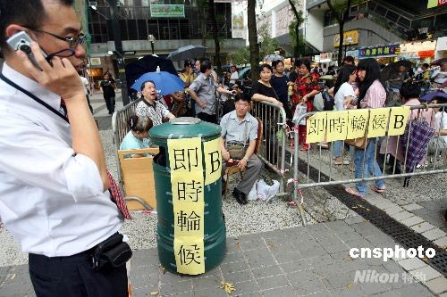 中银香港发行奥运纪念钞掀起全城狂热。连日来数千计市民冒“黄色暴雨”排队轮候,发售奥运纪念钞票的各分行满是拥挤的人龙。七月十五日下午,中银香港尖沙咀分行向通宵排队的市民作登记。 中新社发 洪少葵 摄