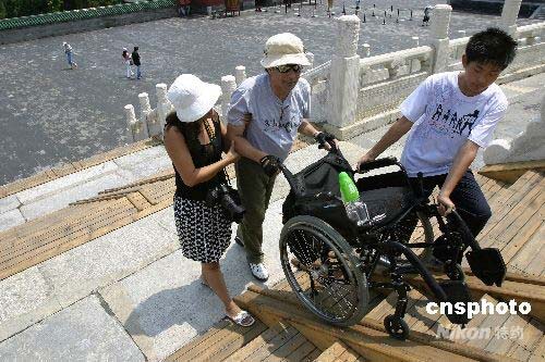 2008年7月15日,一位有腿疾的外国游客在他人的帮助下登上无障碍台阶。为迎接奥运会及残奥会,方便残疾游客,北京天坛公园首次在祈年殿东侧台阶搭建无障碍设施,搭建工作于近日完成。中新社发 鲁谷 摄