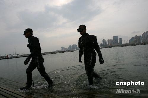 青岛边防支队驻奥帆中心的特勤官兵暑期在奥运会帆船比赛场地进行适应性潜水训练,在贴近实战状态下提高队员处置突发事件等能力。第29届奥运会帆船帆板比赛将于2008年8月9日至23日在青岛国际帆船中心及周边水域举行。中新社发 王瑶 摄