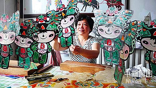 “山西省民间艺术大师”赵翠莲雕刻出奥运福娃系列皮影,表达了山西人对奥运的期盼和祝福。 冯文芳 摄
