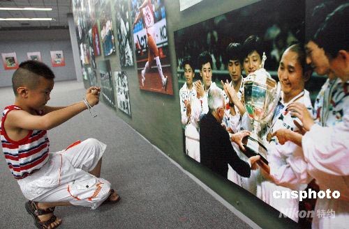 7月16日,由中国侨联主办,中国华侨历史博物馆和中国华侨摄影学会承办的“华人华侨与奥林匹克图片展”在北京开幕。图为一名北京儿童在现场认真拍摄展出的图片。中新社发 廖文静 摄