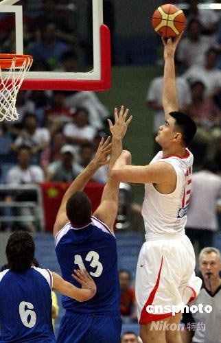 备战北京奥运会的中国男篮,7月17日晚在杭州举行的2008斯坦科维奇洲际杯篮球赛的首场比赛中以96比72战胜几乎全部为年轻选手组成的塞尔维亚队。中国队的“擎天柱”姚明受重伤143天后首次登场,砍下11分。中新社发 任晨鸣 摄