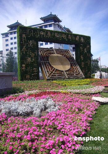 图:日晷、浑天仪造型的奥运花坛亮相北京