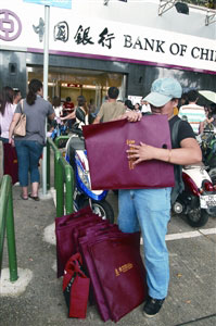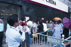 图:澳门银行门外有人收集奥运钞。(图片来源:澳门日报)