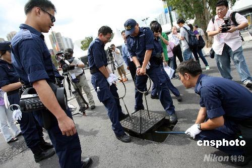 七月十八日,香港警方特别行动队在沙田奥运马术赛场周围进行搜查。香港奥运马术的安保工作目前仍处于最初阶段,未来数周内将会彻底搜查所有的奥运马术场地,然后封锁。中新社发 洪少葵 摄