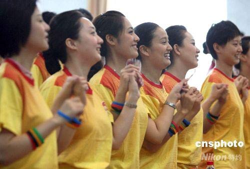 七月十八日,中国国际航空客舱服务部正式成北京奥运会、残奥会文明观众拉拉队。届时这支由客舱服务员组成的拉拉队必将成为一道靓丽的风景线。 中新社发 任海霞 摄