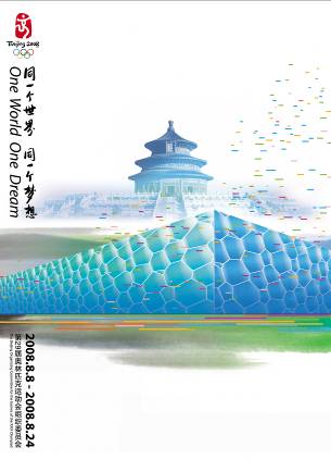 北京奥组委今天(18日)正式对外公布了北京2008年奥运会、残奥会官方海报和官方图片。图为主题海报《文明北京 和谐奥运》。主题海报用象征的手法,由代表北京奥运的体育场馆和经典的北京建筑组成,中国水墨意蕴其间,气韵生动。体育与文化,奥运与中国和谐辉映。该方案三幅合一成为组画。