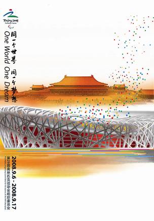 北京奥组委今天(18日)正式对外公布了北京2008年奥运会、残奥会官方海报和官方图片。图为主题海报《文明北京 和谐奥运》。主题海报用象征的手法,由代表北京奥运的体育场馆和经典的北京建筑组成,中国水墨意蕴其间,气韵生动。体育与文化,奥运与中国和谐辉映。该方案三幅合一成为组画。