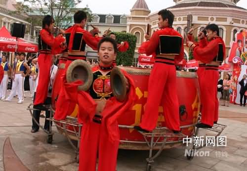 7月19日,北京奥运火炬在大连传递,当地民众敲响威风锣鼓激情迎接奥运火炬。记者周兆军摄