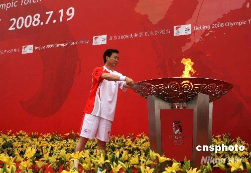 7月19日,随着最后一棒火炬手、大连市市长夏德仁点燃圣火盆,北京奥运火炬圆满结束了在大连的传递。 中新社发 周兆军 摄