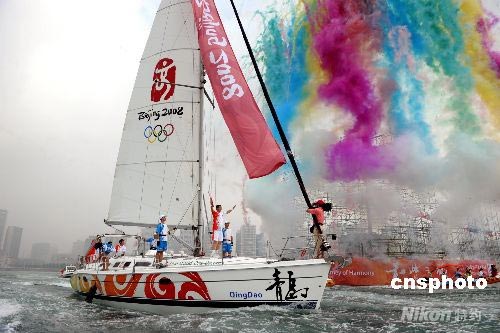 图:"彩云"相伴 奥运圣火在青岛海上传递