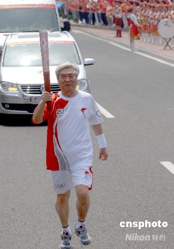 图为神州飞船(1到5号)总设计师戚发轫在青岛传递奥运火炬。 中新社发 廖攀 摄