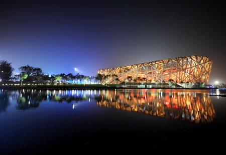 7月18日的台湾《中国时报》这样记录了7月16日晚在“鸟巢”体育馆进行的北京奥运会开幕式的第二次带妆彩排场景。这场彩排首次公开了“鸟巢”夜景照明系统并燃放了礼花。