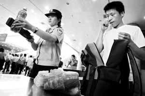 昨天10时许,记者先来到北京西站进站口,比以往更加严格的是,这里除了对每件行李进行机检外,民警还辅助用手持液体查危仪对行李中的液体进行检查,现场铁警告诉记者:“如果发现行李中携带了液体,我们将会要求旅客将液体拿出,并用仪器进一步检测液体安全。”旅客手里拿着的瓶装水,开盖的则要求当场喝一口,没有开盖的则也要过液体安检仪。