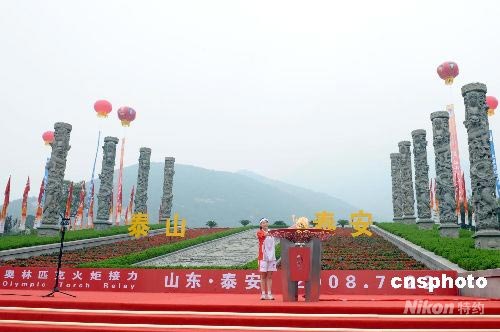 7月22日中午12点42,随着末棒火炬手毕文静在泰安天地广场点燃圣火盆,奥运火炬在泰安的传递结束。泰安是世界闻名的旅游之都,蜚声中外的五岳之首、有国山之称的泰山坐落于此。中新社发 廖攀 摄