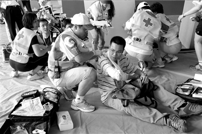 事件发生后,附近的五六名医疗志愿者几秒钟内就赶到现场,随后大批急救人员携带担架等器械向E看台一层楼梯口集结。同时,指挥中心接到报警,迅速通知场馆内急救车就位并调配场馆外的急救车紧急进场。现场急救人员井然有序,有的开始疏散观众,一部分将重伤者用担架抬下来;还有一部分对每一个伤者进行检伤,区分出死亡、危重伤、重伤和轻伤,分别为他们戴上黑色、红色、黄色和绿色的胸牌。