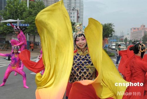 7月23日,奥运火炬在山东济南传递,人们在沿途表演京戏和杂技欢迎奥运火炬到来。 中新社发 廖攀 摄