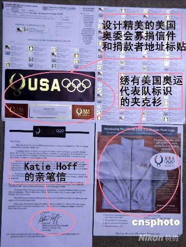 7月22日,记者收到的一封募捐信说:你只需捐20美元,就可以获得一件如图所示的绣着美国奥运代表队标记的运动夹克。更重要的是,这意味着你支持了美国奥运代表队前往北京参赛的路费。信中还附有美国游泳女一号种子选手霍芙的亲笔募捐信。图为来自美国奥委会的募捐信件内容。 中新社发 邱江波 摄