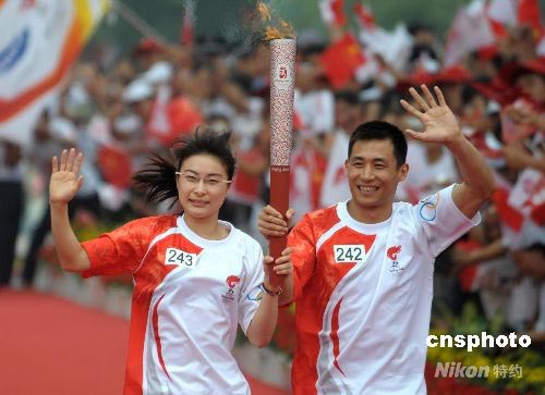 7月23日,奥运火炬在山东济南传递,中国跳水队运动员、世界冠军郭晶晶、王峰共同传递济南最后一棒火炬。 中新社发 廖攀 摄