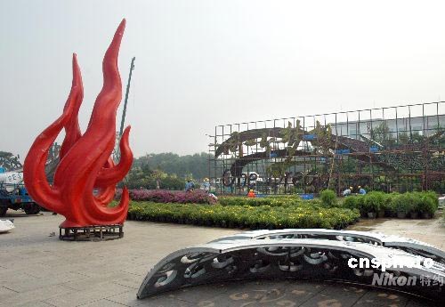 7月23日上午,天安门广场一个火炬造型的装饰景观,红色造型的火炬引人瞩目。天安门广场迎奥运盛会为主题的大型花坛即将完工。中新社发 张双双 摄