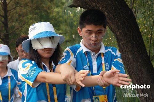 7月23日,北京2008奥林匹克青年营里的志愿者正在进行信任度培训。该培训由两个人进行配合,一个人把眼睛蒙住、一个人把嘴巴封住,完全靠对方的身体语言进行沟通,该培训将有助于志愿者对奥林匹克青年营里首次招募的残疾人营员进行帮助。 中新社发 王东明 摄
