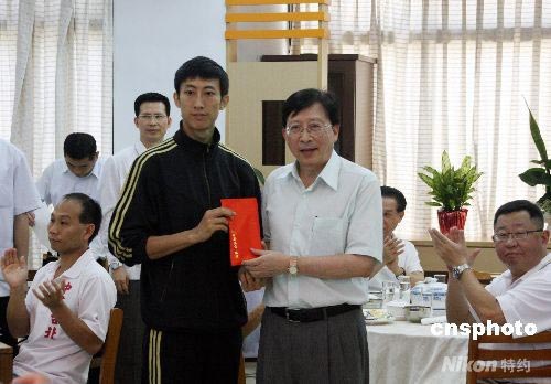 7月23日,台湾行政部门负责人刘兆玄在高雄左营体育训练中心看望备战北京奥运的台湾体育健儿。他期许运动员们全力以赴,取得好成绩。图为刘兆玄在该中心运动员餐厅,向运动员们致赠加菜金,由上届奥运跆拳道冠军朱木炎代表接受。 中新社发 黄少华 摄