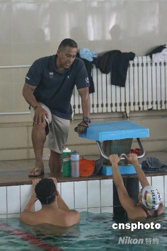 7月24日,参加北京奥运会的哥伦比亚游泳运动员在教练的指导下进行热身训练。据悉,哥伦比亚共有5名游泳运动员和3名跳水运动员取得北京奥运会参赛资格。这些运动员将陆续从美国、加拿大赶赴天津,进行为期10天的集训。 中新社发 郭晓帆 摄
