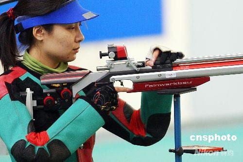 2008年4月12日,中国名将杜丽参加“好运北京”2008国际射联世界杯赛女子十米气步枪决赛。中新社发 富田 摄