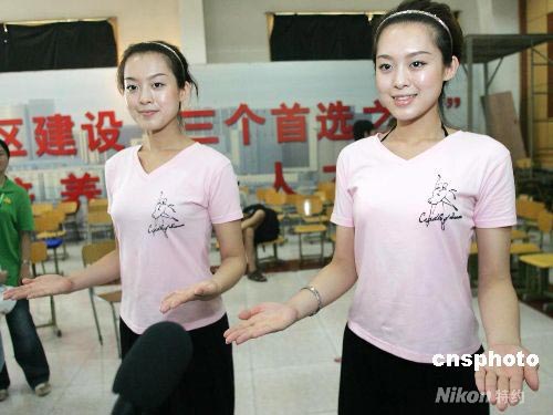 7月24日,中外记者前往北京昌平职业学校探营,19岁双胞胎姐妹花李子晔、李晓晔,在众多颁奖礼仪志愿者中分外抢眼。自2008年7月12日,337名身材修长、面容娇美的颁奖仪式专业志愿者开始北京奥运会颁奖礼仪工作的冲刺培训。较之以往,此次培训除了颁奖礼仪动作、形体训练,特别增加了奥运安保、拓展运动和艺术观摩等课程。本月26日,这批志愿者将到各个场馆进入赛前实地训练。 中新社发 杜燕 摄