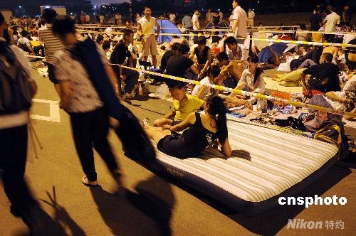 7月25日凌晨,北京两万余市民昼夜排队期盼买到自己喜爱的奥运项目赛事门票。现场有公安、城管、医疗救护、志愿者等工作人员24小时维持秩序,陪护市民有序购票。 中新社发 陈文 摄