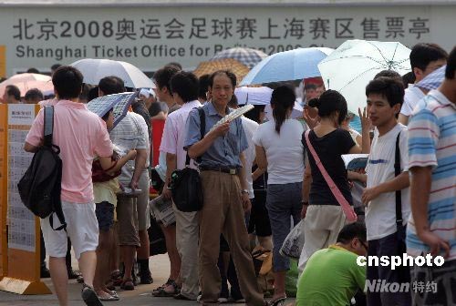7月25日,北京奥运会足球比赛上海赛区门票开始发售,众多球迷通宵排队等候争购奥运门票。据悉,此次发售的是上海赛区所剩余的164737张门票,其中包括男足第3、4名决赛在内的9个场次的门票。价格最便宜的小组赛门票只需要40元,最高为男足第3、4名决赛A票,价格为800元。 中新社发 汤彦俊 摄
