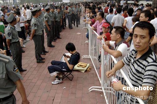 7月25日上午9时,第4阶段奥运门票销售正式开始,北京五棵松篮球体育馆外排队数日的数千球迷在安保人员的指挥下有序入场购买。 中新社发 徐曦弋 摄