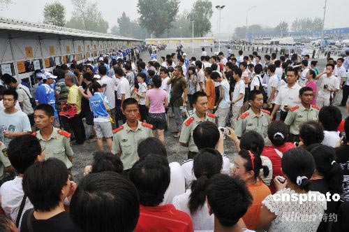 7月25日上午9点,最后82万张北京奥运会比赛门票开始销售。销售现场异常火爆,购买门票的群众分批进入等候,武警官兵一字排开维持现场秩序。中新社发 王宇婷 摄