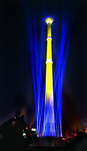 位于四惠桥西北角的国华电力公司高240米的烟囱,是北京地标性建筑。烟囱整体进行了银灰色喷涂处理,白天与天空颜色融为一体。夜晚,烟囱观景平台上增设灯光照明,烟囱顶部安装了花瓣造型的灯具,如同华丽皇冠悬挂于空中,绚烂夺目、五彩斑斓。
