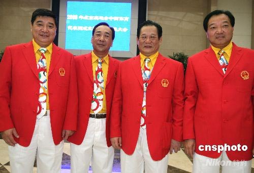 7月25日,参加北京奥运会的中国体育代表团正式成立,代表团总人数共1099人,639名运动员将参加北京奥运会28个大项,38个分项的全部比赛。其中,国家射击队现任总教练王义夫、体操管理中心主任高健、举摔柔运动管理中心主任马文广、中国首枚奥运会金牌获得者许海峰(从左至右)是代表团中参加过七届奥运会的四大“七朝元老”。 中新社发 任晨鸣 摄