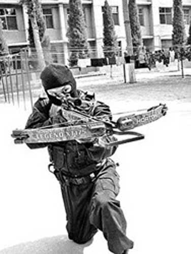 自述:我的外形很传统,乍一看,有些古代暗器的感觉。但我的威力却不是其他普通弓箭所能比拟的。有了高科技的帮助,我的射程大大提高。“百步穿杨”是古代高手的绝技。但如今,有了红外线瞄准器的帮助,任何反恐突击队员在使用我时,都可以百发百中。而强力弩弓的穿透力甚至能将15厘米厚的树木一击即穿。
