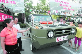 一些市民第一次见到水陆两用车格外新奇,围着车子摸摸看看。
