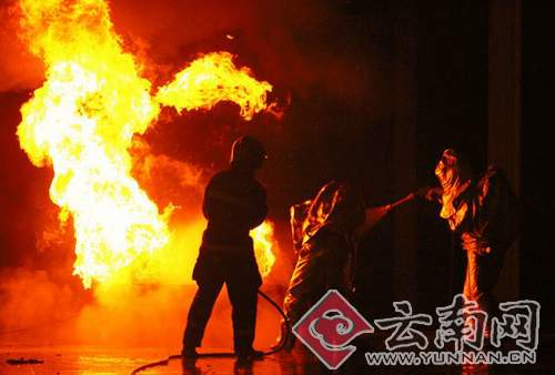 “火凤凰”突击队再次上阵,防爆水炮车、奔驰泡沫战斗车、举高喷射车齐上阵,玉溪、曲靖、文山消防特勤部队也赶来助阵。