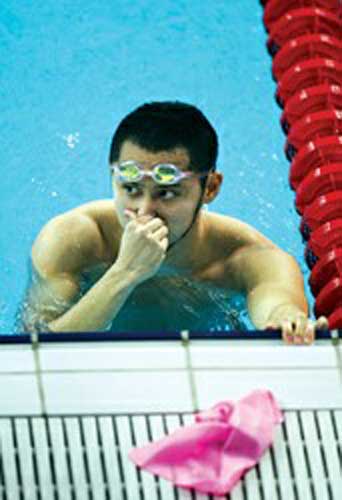 初入“水立方”的北岛,神情怡然。下午6时30分,他先在游泳馆西侧的25米训练池边接受按摩师的按摩。一刻钟后,北岛起身,走向50米比赛池,看台上摄影记者的相机响成一片。