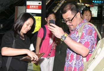 高金素梅率团体前往北京参加北京奥运表演彩排,在机场巧遇唱片制作人李宗盛(右),两人互动热络,相约北京见。 “中央社”图